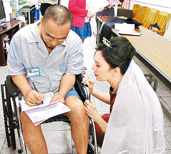 據臺灣媒體報道,臺灣黑幫竹聯幫捍衛隊長孟憲祥與前妻陳微妮,昨天在臺中監獄第二度結婚,戶政人員到場幫兩人辦理結婚登記。孟憲祥因中風右手無力,勉強為新娘掀婚紗、戴婚戒,表情有些別扭,完婚回后臺才對陳微妮說:“原來我的腰圍不是48吋,只有36吋。”她才恍然大悟:“難怪你走得怪,原來怕褲子掉下來!