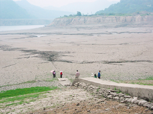 石門水庫大干旱,水位下降,造成溪床見底,大溪鎮阿姆坪大片水域變成干河床。圖片來源:臺灣《聯合報》