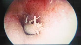 據報道,這名50歲男子到臺北馬偕醫院就診時,只覺得耳朵里怪怪的,偶爾會聽到耳鳴聲,但不覺疼痛。馬偕醫院耳鼻喉科醫師周家儀透過內視鏡,在距離男子外耳道約1.5厘米處,發現一只黃白色、帶有觸須的小蟲,不時蠕動身體,想往耳朵更深處鉆,周家儀以耳抽吸管活逮這只小蟲。