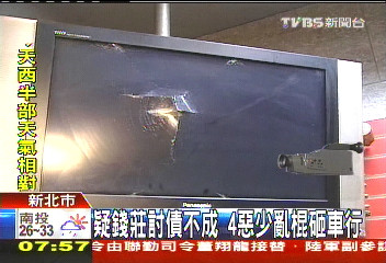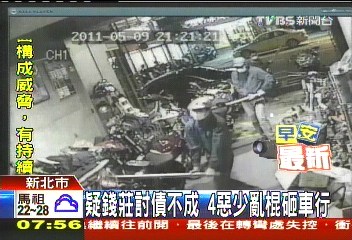 據臺灣TVBS電視臺報道,要錢不成竟然就砸店,昨天晚間9點半左右,臺灣新北市土城區一家重型機車行,遭到4名手持棍棒的少年,瘋狂亂砸,不僅店面遭殃,就連機車都被砸壞7輛,損失慘重,店主表示,3月中旬曾經遭到錢莊份子暴力脅迫,強逼簽下本票,懷疑可能是當時協調不成,才會被挾怨報復。