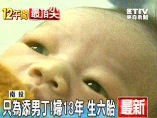 中國臺(tái)灣網(wǎng)5月13日消息 據(jù)臺(tái)灣媒體報(bào)道,臺(tái)灣南投一名31歲婦人為了生男孩,十三年內(nèi)連生六胎,最大的已經(jīng)十三歲就讀小學(xué)六年級(jí),最小的才剛出生。
