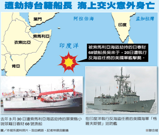 中國臺灣網5月29日消息 據(jù)臺灣《聯(lián)合報》報道,遭索馬里海盜劫持一年多的臺灣漁船“日春財68號”,今年談判稍有進展,近日卻傳來不幸消息。臺灣外事主管部門昨天(28日)指出,5月20日美國軍艦執(zhí)行反海盜任務時,遭劫持的“日春財68號”被海盜當作攻擊母船(人質船),與美軍艦交火,臺籍船長吳來于在雙方交火中身亡。