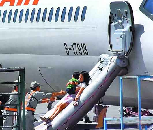 鄭先生說,班機慢慢滑回停機坪時,后座有乘客因忍受不了油煙味及焦味,嚇得不斷跟空服員反映:“有很濃煙味,請快處理!”但未獲空服員回應,直到滑行10多分鐘后,飛機終于停妥,后方旅客不斷鼓噪要求下機,空服員不斷說:“請留在座位上,不要任意走動!”但隨后空服員開始動作,打開左側逃生門,要求乘客不要帶行李,跳逃生筏逃生。