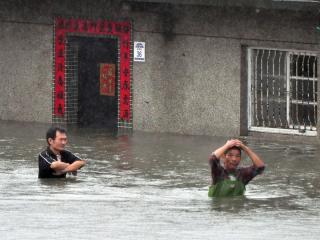 宜蘭下暴雨,加上大潮海水倒灌,五結鄉錦草地區大淹水。圖片來自臺灣“中央社”