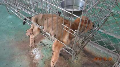 流浪狗被關在鐵籠里神情落寞。(圖片來自臺媒)