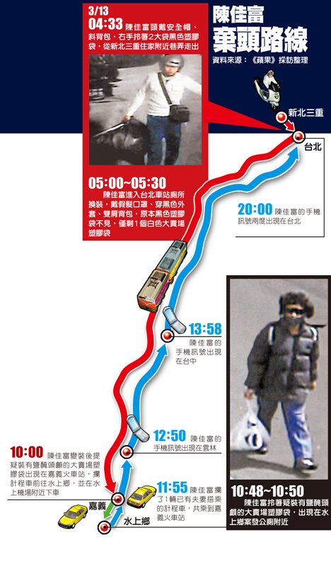 檢警昨表示,經調閱臺北車站監(jiān)視畫面,13日凌晨4時,陳佳富拎著兩大袋黑色塑料袋外出,隨后在臺北車站現(xiàn)身,再進入車站廁所換裝,走出時已戴假發(fā)與口罩、穿上黑色厚重外套、雙肩背包變裝,手上兩個黑色塑料袋消失不見,右手僅拎著一個白色大賣場塑料袋,與嘉義公廁的監(jiān)視影像相符。此外,監(jiān)視器也拍下他以上述裝扮,站在臺鐵第3月臺候車,搭乘清晨列車南下,上午約10時出現(xiàn)在嘉義縣,證實他搭火車帶著頭顱到水上鄉(xiāng)丟棄。