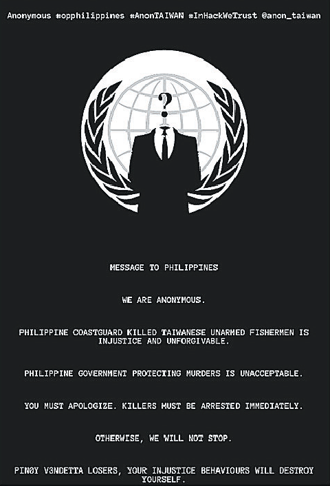 AnonTAIWAN匿名者組織駭入dns.gov.ph網站的首頁,留下網站宣言。(圖片來自臺灣《聯合晚報》)