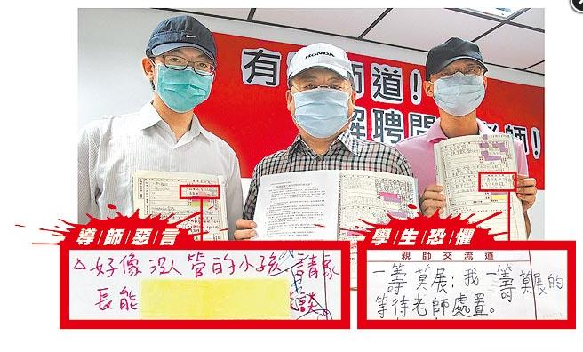 昨天3名家長在人本基金會陪同下開記者會,但3人怕身分曝光影響小孩,全程戴口罩,他們自嘲:“很沒種!學期結束才敢開記者會!3人列舉廖姓男導師諸多不當管教實例,包括在家庭聯絡簿上稱學生“好像沒人管的小孩”、罵學生“過動兒、吃藥了沒?”當學生面前罵學生的媽媽是“白癡”等!