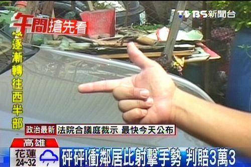 據(jù)臺(tái)灣TVBS網(wǎng)站報(bào)道,臺(tái)灣高雄市一名在電信公司任職的男子,因?yàn)橥\嚰m紛,對(duì)軍官退役的鄰居比出射擊手勢(shì),連帶出聲“砰砰砰”,甚至加以辱罵,鄰居氣不過(guò)提告,要求賠償30萬(wàn)(新臺(tái)幣,下同)精神撫慰金,法官最后判處3.3萬(wàn)元。