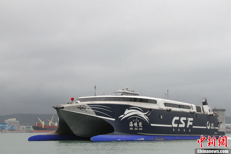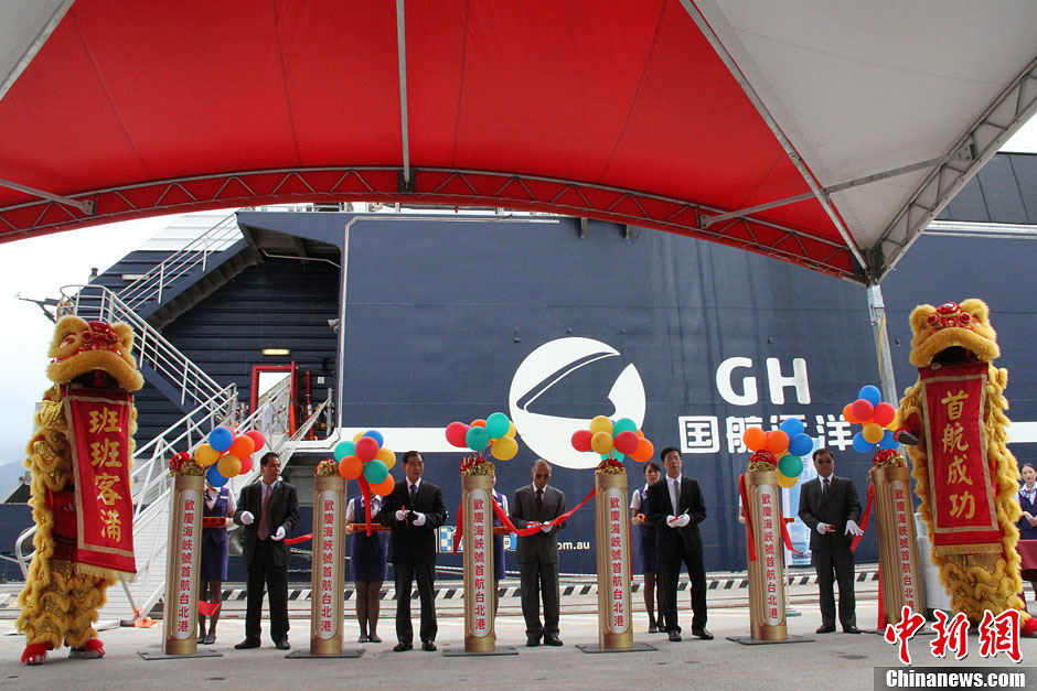 10月9日,“海峽號”高速客滾船首航臺北。平潭—臺北航線開通后,將先期開展客運業(yè)務(wù),隨即將積極開展貨運業(yè)務(wù)。中新社發(fā) 王東明 攝