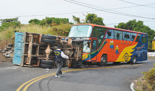 由黃姓司機駕駛的砂石車,昨天上午9時27分,滿載廢柏油塊下山,不知何故,失控翻覆沖到對向車道,撞向正要上山的游覽車。