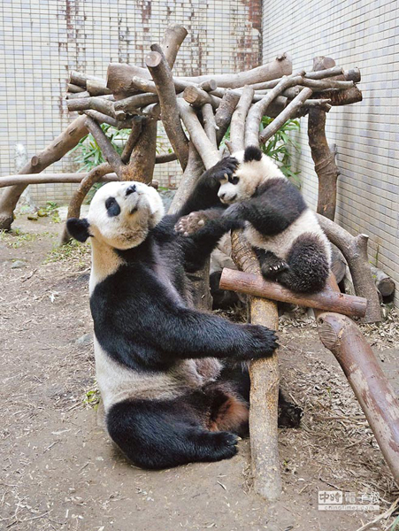 臺北動物園初一開園,大貓熊寶寶圓仔和媽媽圓圓到戶外活動,圓仔小手揮到媽媽,立刻被圓圓“巴頭”。來源:臺灣《中國時報》