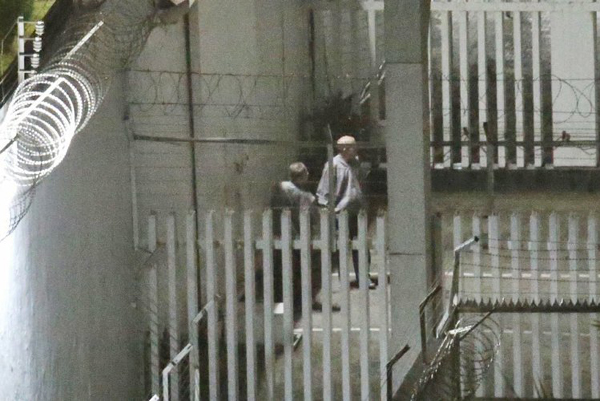 凌晨直擊兩名嫌犯持長槍現身監獄走道上,疑似持槍戒備。 來源:臺灣《聯合報》(記者程宜華 攝)