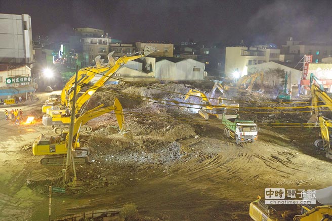 維冠大樓倒塌,報案協尋的人員在13日下午全部尋獲,13日晚間現場已幾乎清理為平地,即將展開重建之路。(圖片來源:臺灣《中時電子報》)