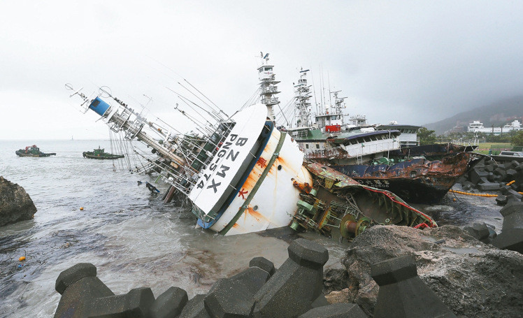 “莫蘭蒂”過后,高雄西子灣北側(cè)防坡堤有四艘大型遠(yuǎn)洋漁船擱淺,傳出有一人不幸罹難。臺當(dāng)局“漁業(yè)署”與海巡人員上午還在現(xiàn)場搶救。(圖片來源:臺灣聯(lián)合新聞網(wǎng))