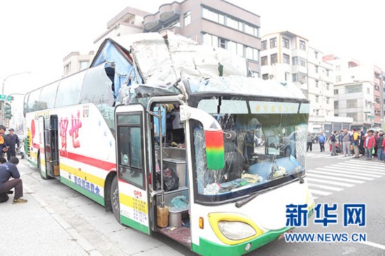 2月4日,一輛滿載大陸游客的游覽車在臺(tái)灣高雄市失控撞到路邊橋墩,造成車上多人受傷送醫(yī)。 新華社發(fā)