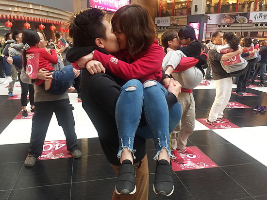 西洋情人節超放閃。微風集團12日提前舉辦接吻比賽活動,百人參賽激吻,冠軍大獎可獲得iPhone7外加鐵路環島車票,只見眾人都吻到忘我。(“中央社”)
