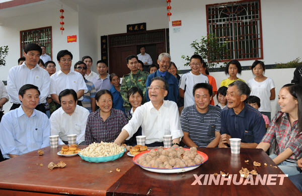 9月24日至26日,中共中央政治局常委、國務院總理溫家寶來到四川地震災區考察指導災后恢復重建工作,看望慰問廣大干部群眾。這是9月24日,溫家寶在青川縣涼水鎮涼華村災后村民新居院內向村民了解安居房建設情況。新華社記者黃敬文攝