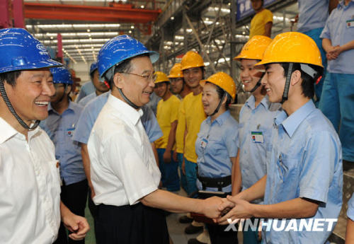 9月24日至26日,中共中央政治局常委、國務院總理溫家寶來到四川地震災區考察指導災后恢復重建工作,看望慰問廣大干部群眾。這是9月25日,溫家寶在東方汽輪機有限公司新生產基地看望一線工人。新華社記者黃敬文攝
