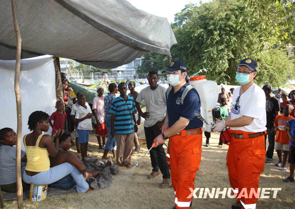 1月17日,中國國際救援隊醫(yī)療隊員在海地太子港臨時居住區(qū)內(nèi)噴灑消毒劑。新華社記者 袁滿 攝