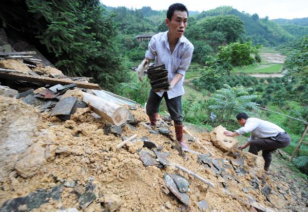 5月20日,廣西融安縣雅瑤鄉(xiāng)雅瑤村大弄屯,村民在倒塌的房屋前清理可用的物品。