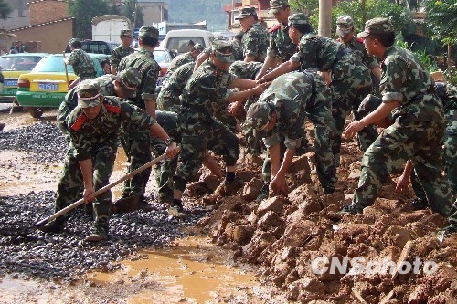 云南省曲靖市馬龍縣境內近日突降特大暴雨,連續7個小時的強降雨造成該縣縣城被淹,4個鄉鎮11個村委會100多個自然村5萬多人受災,1人死亡,165人受傷,4000多人被困。武警云南總隊曲靖支隊200名官兵第一時間展開救援。圖為清理淤泥。 中新社發 陳世亮 攝