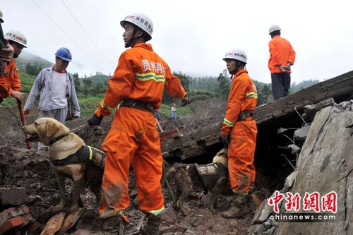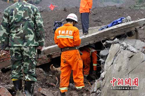 29日,消防官兵在貴州關嶺山體滑坡現場攜搜救犬在泥濘中工作。