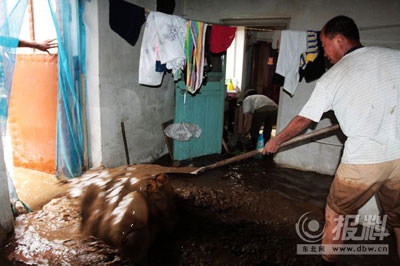 鐵嶺鎮鐵嶺二村村民正在家中排除積水。莊文斌攝(圖片來源:東北網)