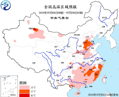 預計,4日白天,江漢南部、江南大部、華南大部、貴州東部、重慶中西部、四川盆地東北部等地有35~37℃、局地38~40℃的高溫天氣。另外,北京中南部、河北大部、山西南部、河南北部和東部、山東西部、安徽北部、陜西關中地區等地的部分地區也將有35~37℃、局地38~39℃的高溫天氣。