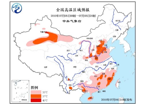 中央氣象臺于4日18時繼續(xù)發(fā)布高溫黃色預(yù)警:預(yù)計,5日白天甘肅西北部、內(nèi)蒙古西部的部分地區(qū)、陜西東北部和關(guān)中地區(qū)、山西中南部、河北中南部、北京中南部、天津、河南、山東中西部、湖北西北部、安徽北部、江蘇北部、江南中南部、華南大部、貴州南部等地有35~37℃、局地38~40℃的高溫天氣。