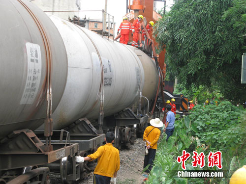 中新網記者在事故發生兩小時后趕到現場,看到事發地已經到處是身穿橘黃色衣服的鐵路救援人員,5節裝滿柴油的油罐車廂的其中一邊車輪脫離鐵軌,但車廂并沒有翻覆。警察已拉起警戒線,但事發地位一交通繁忙的鐵道口,來往車輛行人不斷,大多數人在匆匆看了一眼事故后就離去。