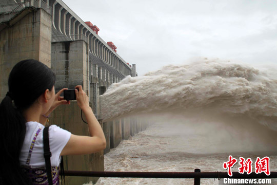 資料圖:7月20日上午,建庫以來最大洪峰抵達三峽大壩。 圖為大壩瀉洪。 劉良偉、郭曉瑩、上官純青 攝