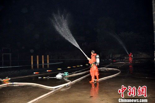 消防官兵正在現場稀釋泄漏的氯氣。中新網發 唐俊勇 攝