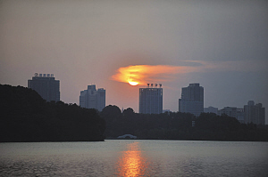 “彩云追日”景象昨日傍晚出現(xiàn)在玄武湖畔,落日在薄云映襯下好似一個正在燃燒的火炬。劉瀏 攝
