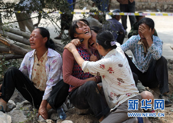 8月10日,幾名失去親人的受災群眾在廢墟旁哭泣。截至當日14時,甘肅舟曲縣特大泥石流災害救援已經過去63小時,臨近72小時“黃金救援期”。目前,解放軍、武警和當地群眾正全力投入搜救工作,爭分奪秒地搶救生命。新華社記者 聶建江 攝