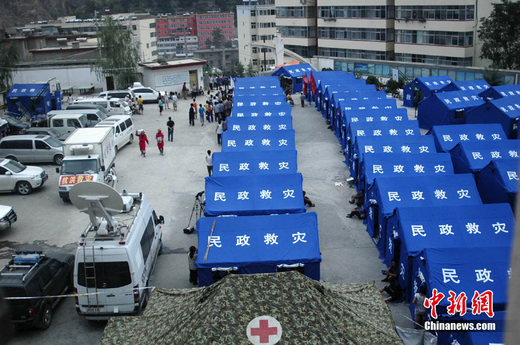 8月10日晚,設在甘肅舟曲三中的受災民眾安置點內架起很多救災帳篷,家園被毀人們的生活在這里得以繼續。據民政部網站消息,截至8月10日16時,民政部從中央救災物資儲備庫調運的物資中已有5000張折疊床和5000條睡袋運抵舟曲災區,其余5000頂12平方米單帳篷、200頂36平方米大帳篷、2萬件棉大衣、3000張折疊床預計10日夜間運抵。中新社發 楊鴻 攝