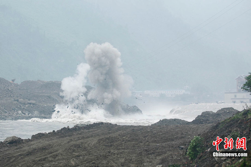 8月17日下午,映秀泥石流搶險救災指揮部對致使岷江改道的堰塞體進行了第二次爆破