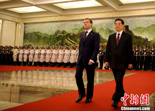 9月27日,中國國家主席胡錦濤在北京人民大會堂舉行儀式歡迎俄羅斯總統(tǒng)梅德韋杰夫訪華。中新社記者 廖攀 攝