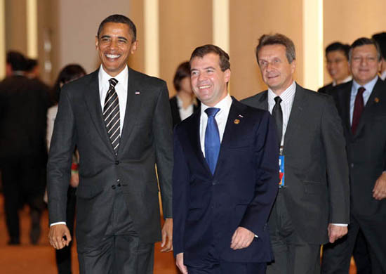 11月12日,美國總統奧巴馬(前左)和俄羅斯總統梅德韋杰夫(前右)步入二十國集團首爾峰會全體會議會場。當日,二十國集團第五次峰會第一次全會在韓國首爾正式召開,會議將關注全球經濟合作和推動世界經濟持續復蘇等重大議題。 新華社發