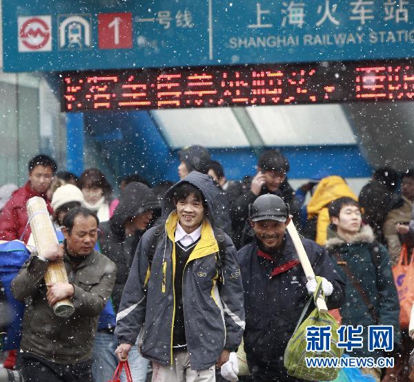 1月18日,旅客正冒雪前往上;疖囌境塑嚒槠40天的2011年春運(yùn)將于1月19日正式啟動。春運(yùn)期間,全國旅客運(yùn)量預(yù)計將達(dá)到28.53億人次,比上年春運(yùn)增長11.6%,全國鐵路預(yù)計發(fā)送旅客2.3億人次,同比增加2554萬人次,增長12.5%。新華社記者 裴鑫攝