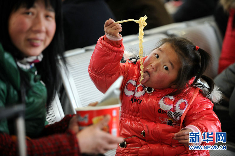 1月19日,與媽媽一同前往深圳過年的余明麗小朋友在合肥火車站候車室吃方便面。當日,2011年鐵路春運正式啟動。2011年鐵路春運自2011年1月19日起至2月27日止,為期40天。春運期間,全國鐵路預計發送旅客2.3億人次,同比增加2554萬人次,增長12.5%,日均575萬人次。其中,發送直通旅客9200萬人次,同比增長11.6%。新華社記者李健攝