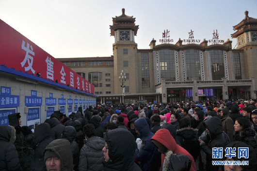 1月22日,人們在鐵路北京站前排隊買票。昨日上午,車站開始發售臘月二十八的火車票。新華社發(樊甲山 攝)