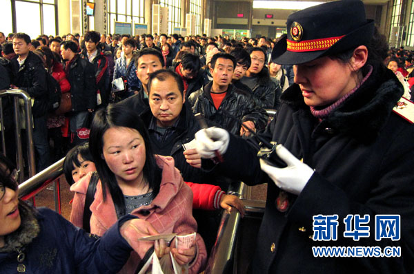 2月7日,旅客在鄭州火車站進(jìn)站上車。當(dāng)日是農(nóng)歷正月初五,春節(jié)假期接近尾聲,鄭州火車站返程客流明顯增多。鐵道部發(fā)布的信息顯示,節(jié)后客流壓力將大大超過(guò)節(jié)前,第一個(gè)返程高峰將在2月8日出現(xiàn)。新華社記者 陳飛 攝