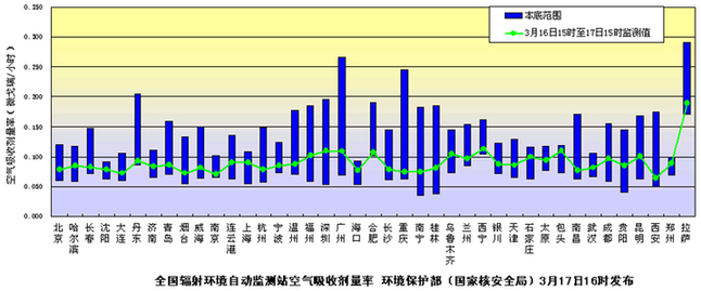 環(huán)境保護(hù)部、國(guó)家核安全局17日16時(shí)繼續(xù)發(fā)布全國(guó)省會(huì)城市和部分地級(jí)市輻射環(huán)境自動(dòng)監(jiān)測(cè)站實(shí)時(shí)連續(xù)空氣吸收劑量率監(jiān)測(cè)值。監(jiān)測(cè)結(jié)果匯總圖顯示,所有城市監(jiān)測(cè)值均在其天然本底水平范圍內(nèi)。監(jiān)測(cè)結(jié)果表明我國(guó)輻射環(huán)境水平未受到日本核電事故的影響。