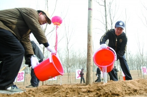 昨日,通州濱河公園,國家氣象局局長鄭國光(右)在給剛剛種下的樹澆水。記者 王申 攝