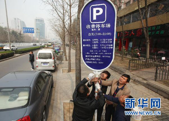 3月31日,北京公聯(lián)順達(dá)停車管理公司的工作人員在街頭更換新的收費(fèi)標(biāo)準(zhǔn)牌。王丹 攝