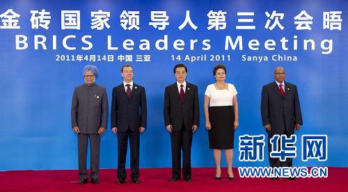 金磚國家領導人第三次會晤14日在海南省三亞市舉行,中國國家主席胡錦濤、巴西總統羅塞夫、俄羅斯總統梅德韋杰夫、印度總理辛格、南非總統祖馬出席。胡錦濤主持會晤并將發表重要講話。