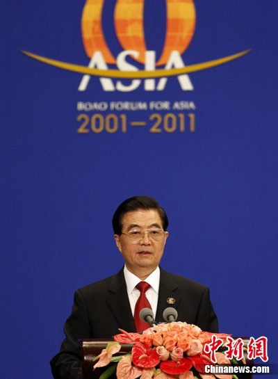 4月15日上午,中國(guó)國(guó)家主席胡錦濤出席博鰲亞洲論壇2011年年會(huì)并發(fā)表主旨演講。中新社發(fā) 任晨鳴 攝
