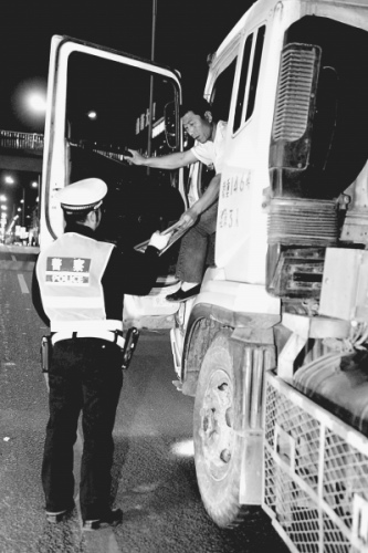 5月2日晚,北京交警在廣渠門橋對過往車輛進行例行檢查。記者 楊慧峰攝