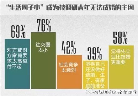 中國(guó)關(guān)心下一代工作委員會(huì)健康體育發(fā)展中心逼婚現(xiàn)狀調(diào)查報(bào)告顯示:逾七成人曾被父母逼婚,25至35歲的“單身汪”壓力最大,被逼婚率高達(dá)86%,女性被逼婚率比男性高6%。生活圈子小是被調(diào)查者無(wú)法成婚主因。調(diào)查主要針對(duì)國(guó)內(nèi)40歲以下人群。
